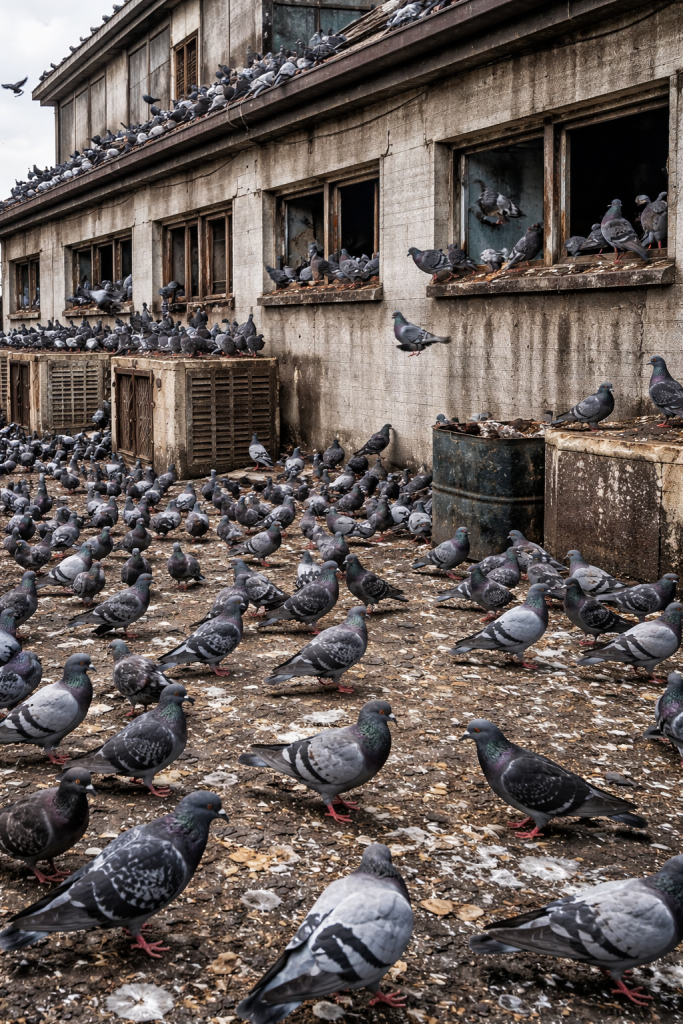 Pigeons can quickly become a serious issue. Their droppings are not just unsightly — they are acidic, causing long-term structural damage to buildings, machinery, and vehicles. They also carry parasites and pathogens, creating potential health risks, especially in areas where food is handled or stored. Once established, pigeon populations tend to grow rapidly and become increasingly difficult to control.